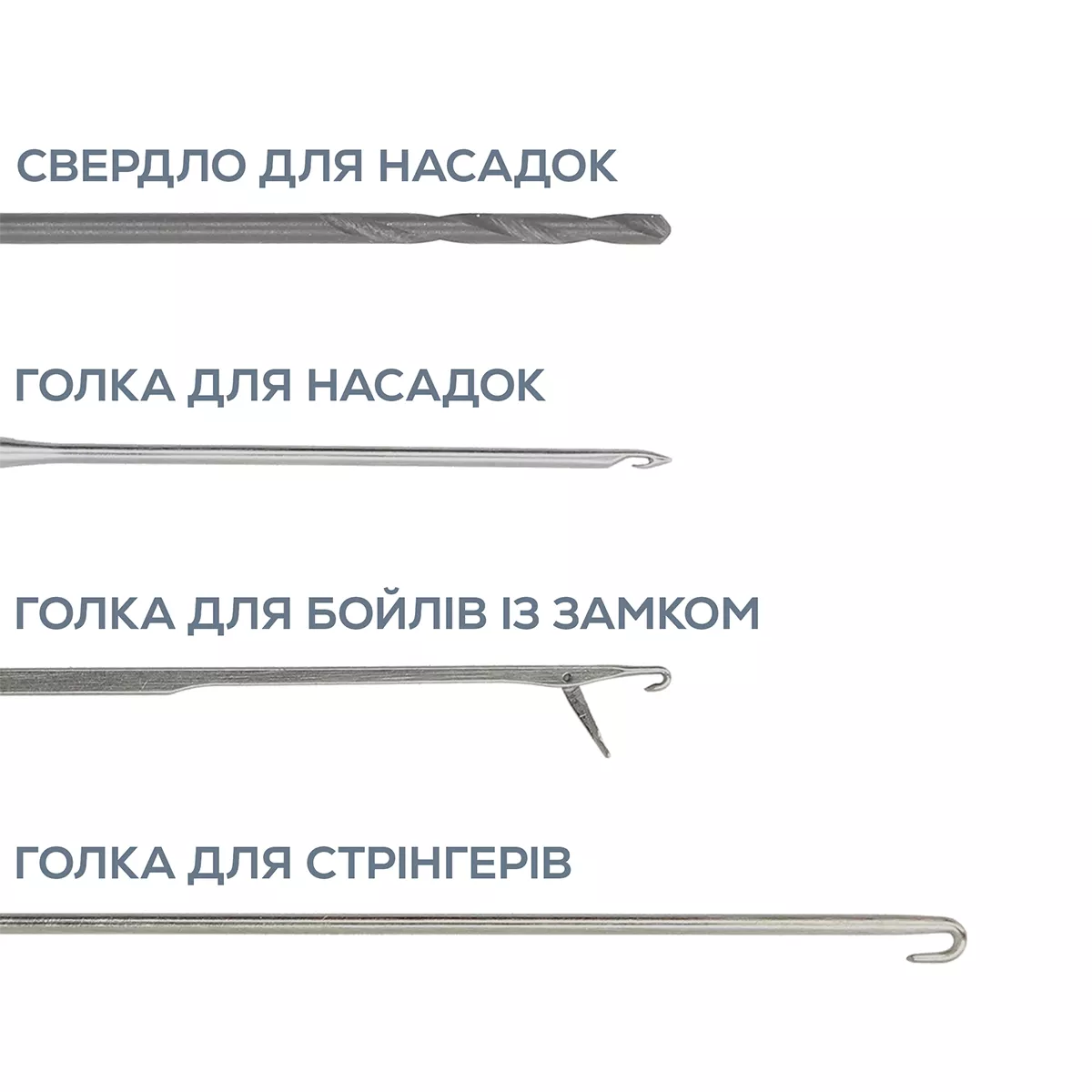 Комплект включає три голки і спеціальне свердло для бойлів, виготовлені з нержавіючої сталі, що гарантує стійкість до корозії та тривалу службу. Компактний формат набору робить його зручним для транспортування – він легко поміститься в риболовецьку сумку чи коробку.