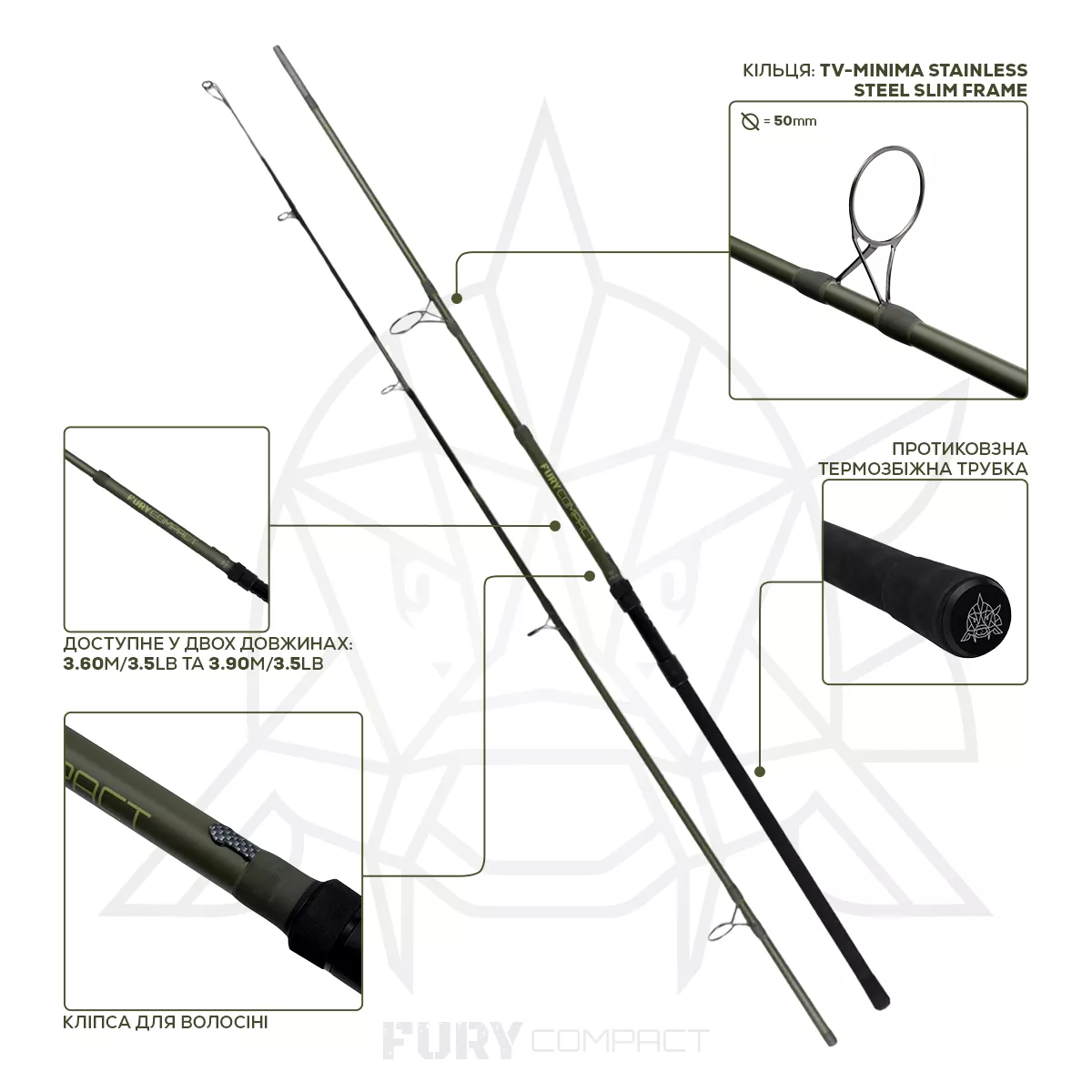 Ще один плюс, це зменшення довжини вудилища з оснащенням. Це необхідно при так званих сталкінгових або пошукових риболовлях з частою зміною місця. Бланк Fury Compact виготовлений з високомодульного карбону і завдяки цьому достатньо міцний, надійний та потужний. Підходить для силових закидів оснащення та ПВА-пакетів, боротьби з великими рибами, а також ідеальний для лову на течії, риболовлі "у завіз" або з човна.