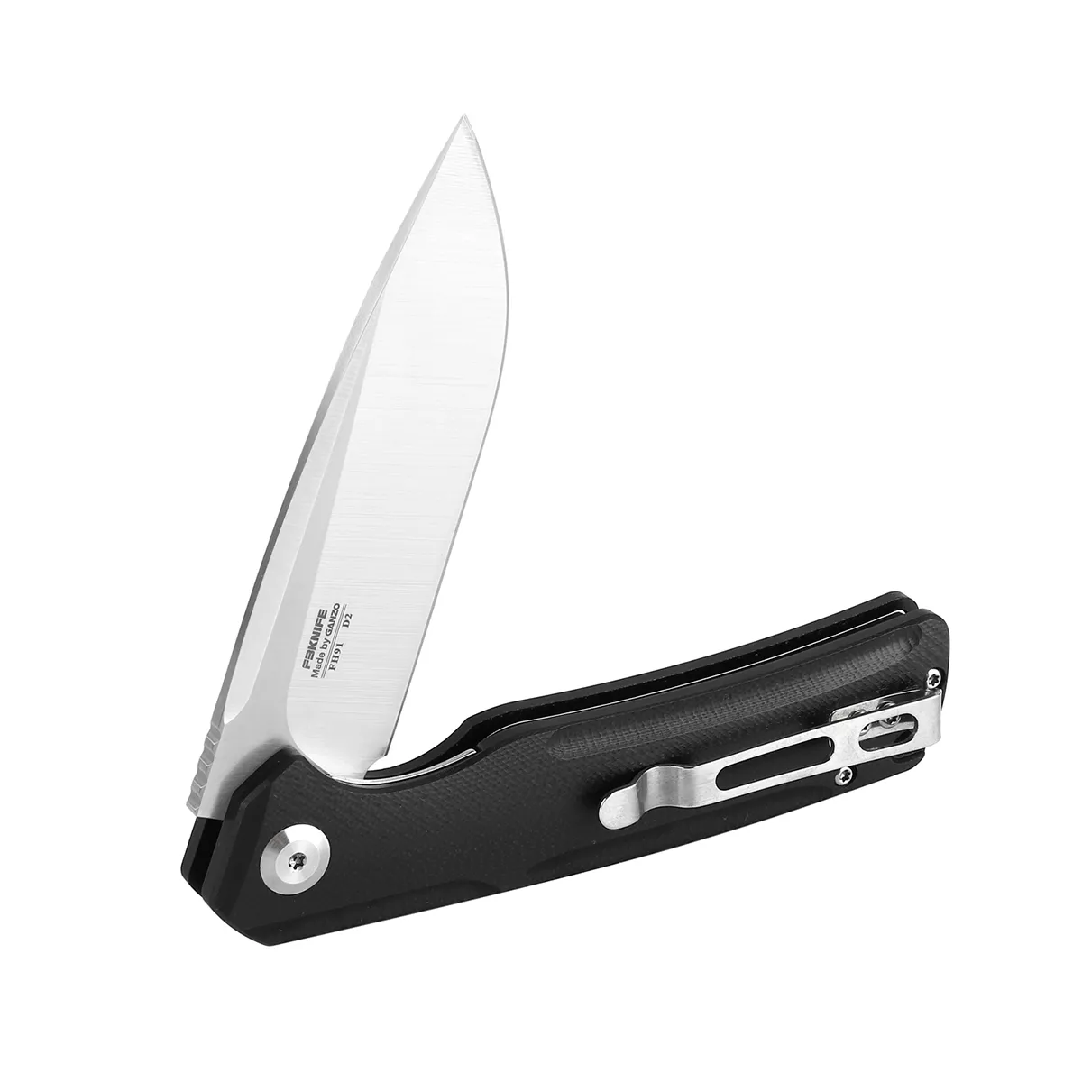 Ніж-фліппер FH91 виконаний з надійною сталі марки D2, і має відмінну твердість близько 60 одиниць Роквелла. Тип заточення – прямий. Це ніж кишенькового формату, з формою леза drop-point. Клинки різновиду drop-point дуже популярні, їх часто можна зустріти на моделях ножів. Відмітні особливості: лезо нагадує по виду normal blade, однак вістря опущено ближче до центру леза. Лезо демонструє хороші ріжучі та колючі здібності. Універсальність профілю дозволяє застосовувати вироби з клинками такого типу в якості мисливських і туристичних, господарсько-побутових, тактичних, EDC та інших. Ніж захищений від іржі, розрахований на тривалу експлуатацію.