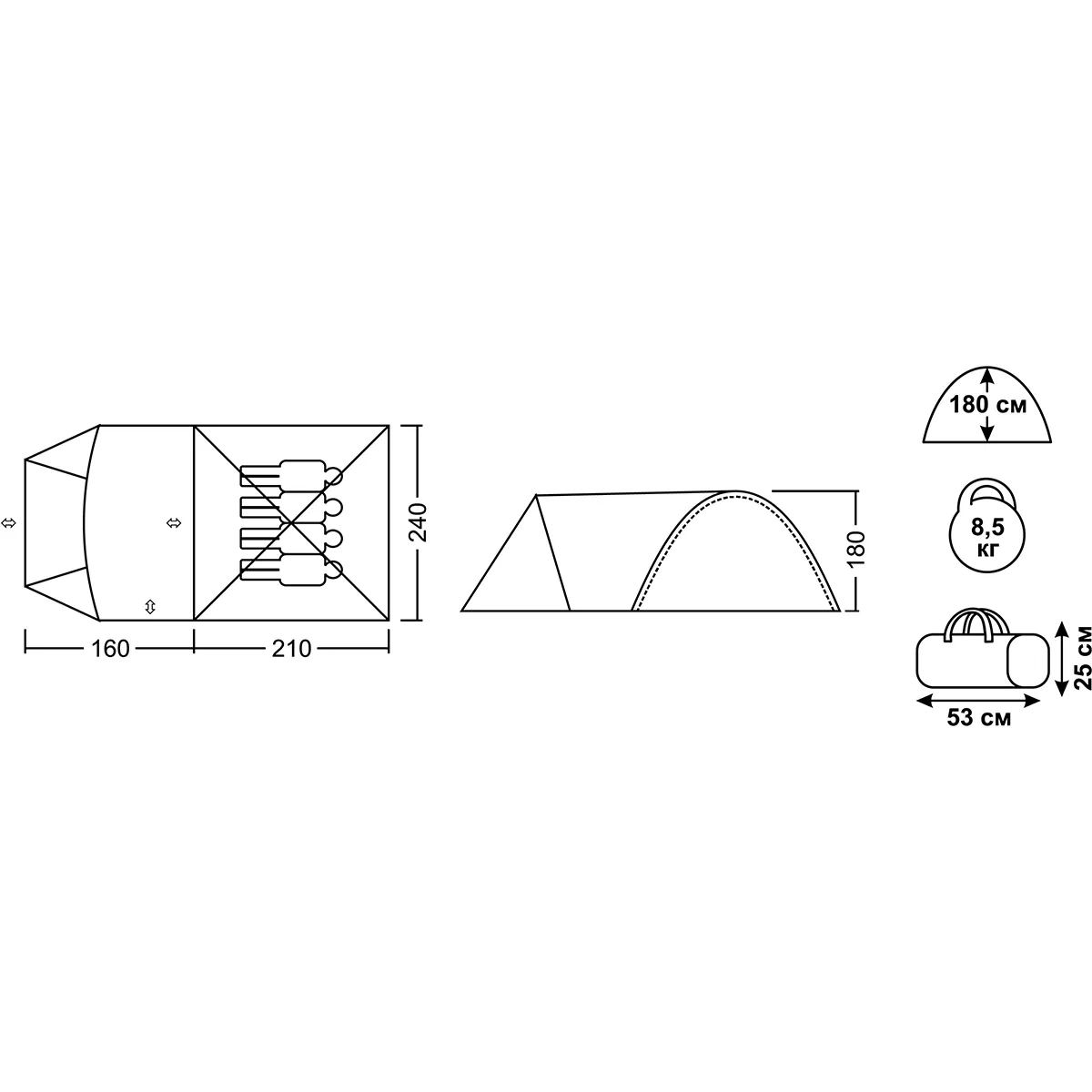 Намет укомплектований фібергласовими дугами діаметром 11 мм і 9.5 мм та 4.5 мм кілками для кріплення намету до землі.