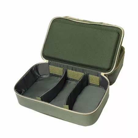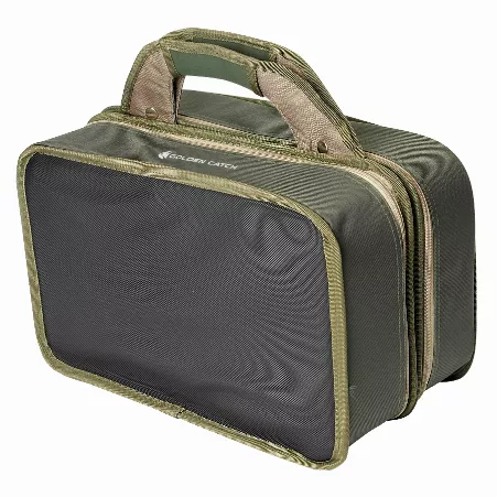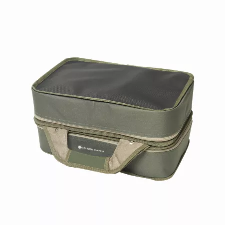 Сумка Golden Catch - містка коропова сумка з додатковими можливостями. Має два великі відділення. Одне з відділень має дві знімні перегородки на липучках. Це дозволяє максимально ергономічно розмістити у ньому снасті. У це відділення без проблем поміщається три великі коропові котушки. Друге відділення комплектується однією корповою коробкою з безліччю перегородок. Також у цьому відділенні вмістилися шість баночок для дипування та зберігання бойлів.