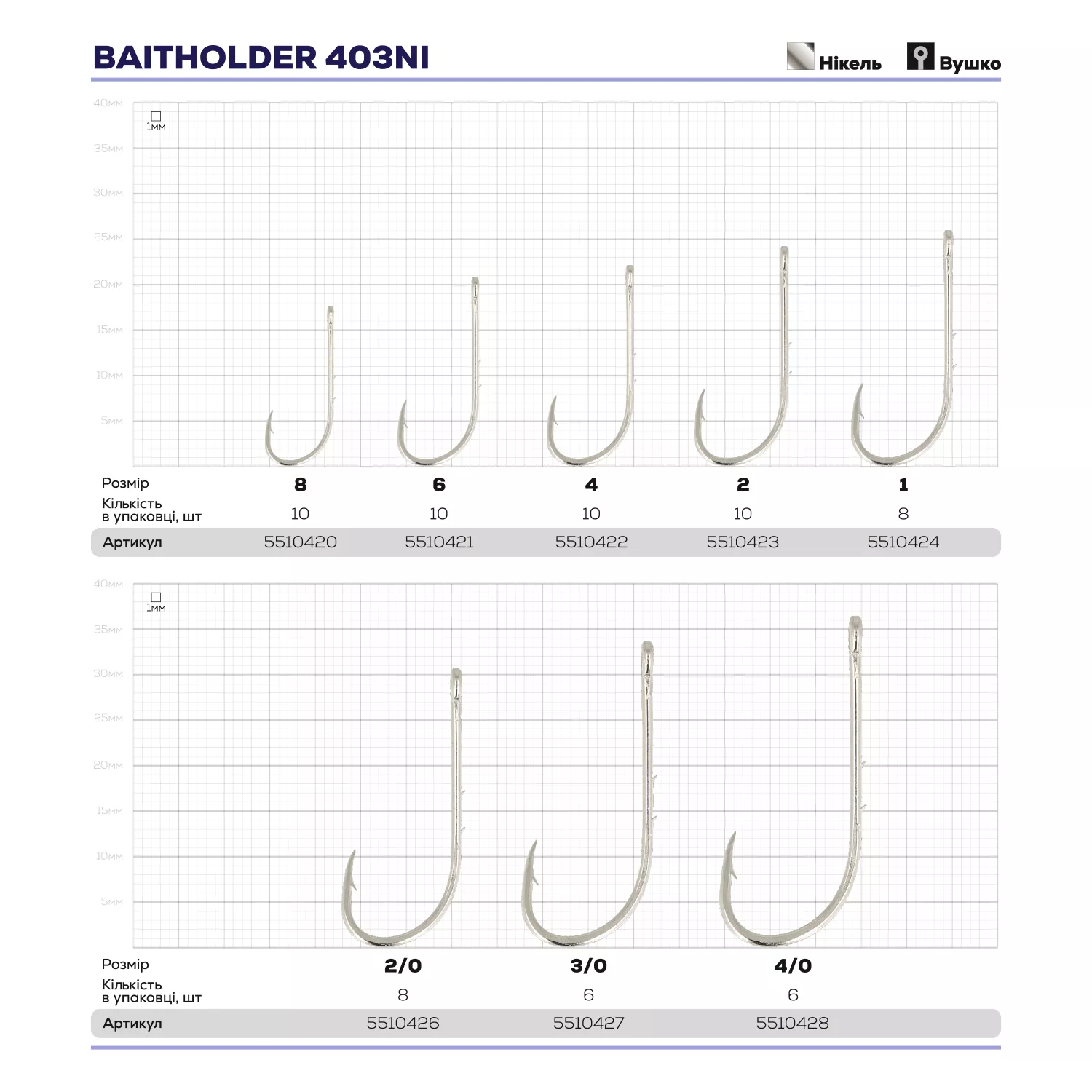 Baitholder доступні в розмірах від 8 до 4/0. Хімічна заточка жала в парі з округлим підчепом забезпечує чудову засікаємість.