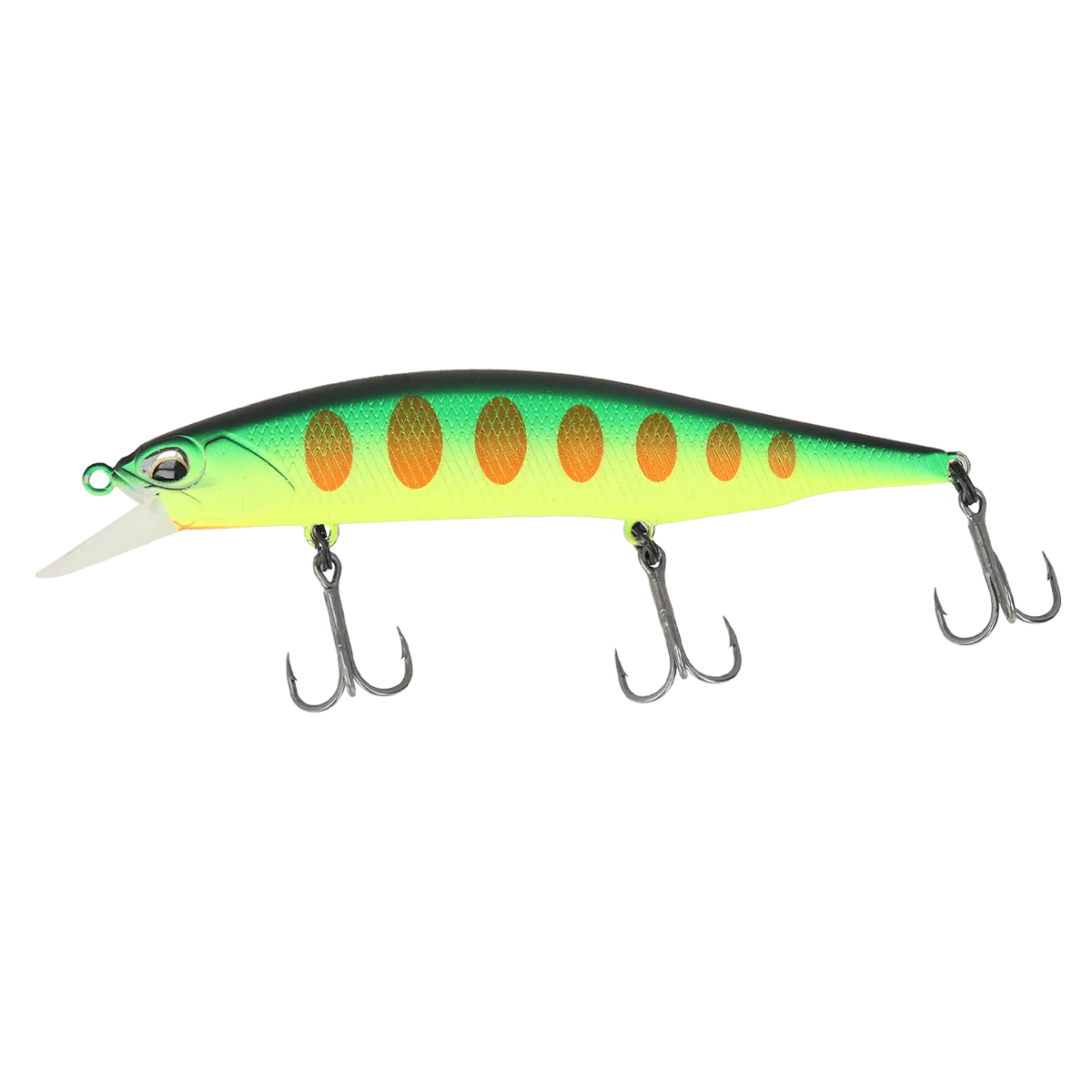 Воблер оснащен тремя острыми тройниками, обеспечивающими надежное засекание рыбы во время атаки. Длина приманки составляет 110 мм, а вес – 17 г, что делает его идеальным для дальних забросов и стабильной работы под водой. Воблер работает на глубине от 0.8 до 1.5 м, позволяя эффективно облавливать как мелководные, так и средние глубины.