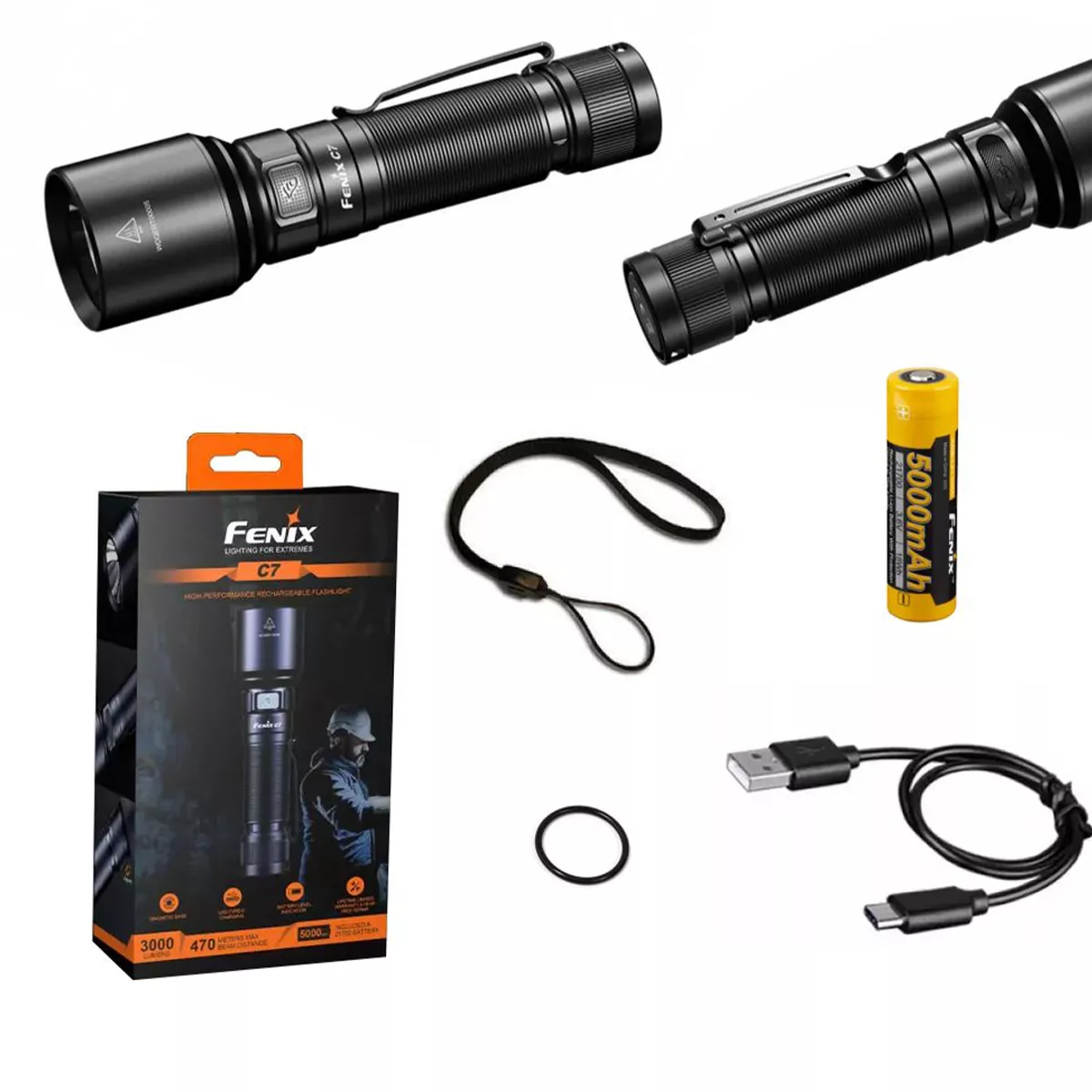 Фонарь Fenix C7 – высокопроизводительная ручная модель для промышленного обслуживания и применения. Зарядка осуществляется с помощью USB Type-C, в комплекте литий-ионная батарея ёмкостью 5000 мА·ч. Способен выдавать максимальную яркость 3000 люмен в турбо-режиме на дальность луча до 470 метров.