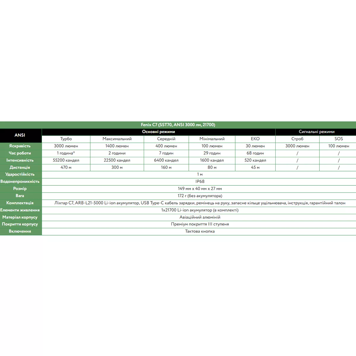 Модель фонаря Fenix C7, литий-ионный аккумулятор Fenix ARB-L21-5000, кабель для зарядки USB Type-C, темляк, запасное уплотнительное кольцо, руководство пользователя, гарантийный талон.