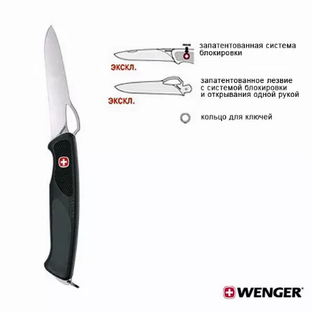 Есть модели в которых лезвие можно открывать и закрывать одной рукой. У всех моделей есть система фиксации клинка в открытом состоянии - это делает невозможным самопроизвольное закрытие клинка. Для снятия с фиксации необходимо лишь нажать на логотип Wenger ( швейцарский крест ).
