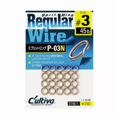 Split Ring Regular Wire это стандартные, средние по мощности и толщине проволоки кольца размером от #1 до #4 и тестом от 7,5 до 24,4 кг. Они отлично подойдут для оснащения воблеров, блёсен и других приманок среднего и тяжёлого класса. Преимущество таких колец, например, при оснащении воблеров минноу в том, что они имеют отличные разрывные показатели. При этом Regular Wire не переутяжеляют воблер, что позволяет сохранить изначальный тип плавучести.